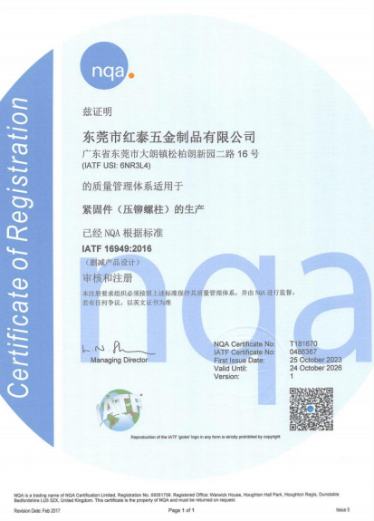 東莞市紅泰五金制品有限公司,公司占地六千多平方米,擁有五十多組螺絲機及六十臺自動車床設備。是一家專業設計、生產ISO、DIN、GB、JIS、ANSI、BS及客戶指定特殊要求的高精密五金緊固件的制造企業。